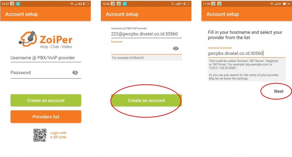 2. Selanjutnya, buka aplikasi Zoiper yang sudah di instal. Kemudian pilih Create an account dan masukan detail seperti dibawah ini: