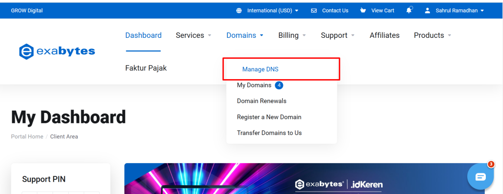 3. Selanjutnya, pilih menu Domain, kemudian pilih Manage DNS.