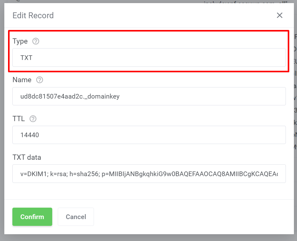 6. Selanjutnya, pilih tipe TXT, kemudian masukan detail DKIM sesuai intruksi DKIM.