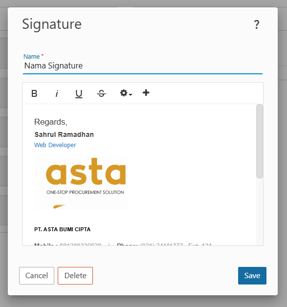 4. Selanjutnya, masukan signature sesuai template yang ada di bawah ini, kemudian sesuaikan isinya dengan detail identitas Anda.